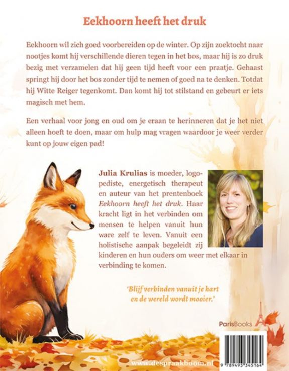 Eekhoorn wil zich goed voorbereiden op de winter. Op zijn zoektocht naar nootjes komt hij verschillende dieren tegen in het bos, maar hij is zo druk bezig met verzamelen dat hij geen tijd heeft voor een praatje. Gehaast springt hij door het bos zonder tijd te nemen of goed na te denken. Totdat hij Witte Reiger tegenkomt. Dan komt hij tot stilstand en gebeurt er iets magisch met hem. Een verhaal voor jong en oud om je eraan te herinneren dat je het niet alleen hoeft te doen, maar om hulp mag vragen waardoor je weer verder kunt op jouw eigen pad!